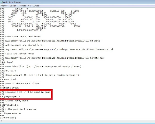 – Busca en las carpetas del juego el archivo codex.ini o steam_api.ini, puede tener otro nombre según los crackers del juego, debes buscar el archivo que termine en .ini, a este archivo le das Click Derecho > Propiedades, si figura como “Sólo lectura” desmarca esa casilla y pon Aceptar. Luego ábrelo con el Bloc de Notas y ve donde aparece Language=english y lo cambias por Language=spanish y guárdalo.